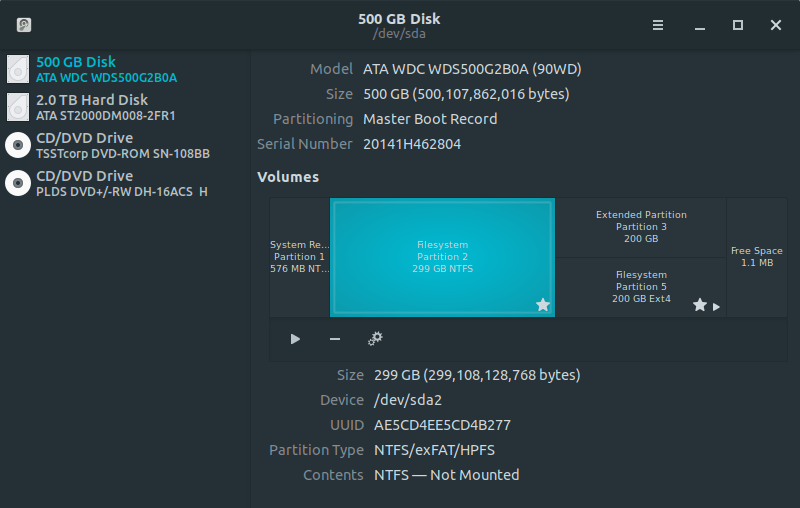As you can see, I have multiple disks each with multiple partitions. I know that my Windows partition is formatted as NTFS and is about 300 GB in size, so I was able to determine that device /dev/sda2 is my Windows installation. Note that the device name may differ on your machine. In my Windows installation, I also have a secondary disk with a NTFS partition for storage (I call it my “XtraDisk”) mapped to the “X:\” drive (clever name & drive letter, I know). That partition is device /dev/sdb1.
