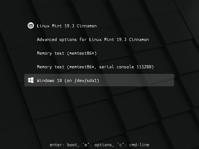 5. If I select the “Windows boot” option, the screen flashes and it’s right back to the same menu but with the top/default “mint boot” selection highlighted. No error messages (or if so they are gone before I can see them).