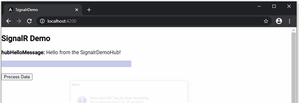 Click the “Process Data” button, and the SimulateDataProcessing() method on the Hub is called, updating the process bar.