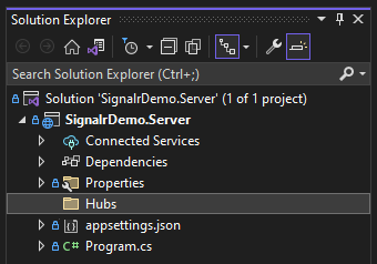 Right click the Signalr.Server project, and create a folder called “Hubs.” Right click the folder and select “Add” > “Class…” and name the new class SignalrDemoHub.cs: