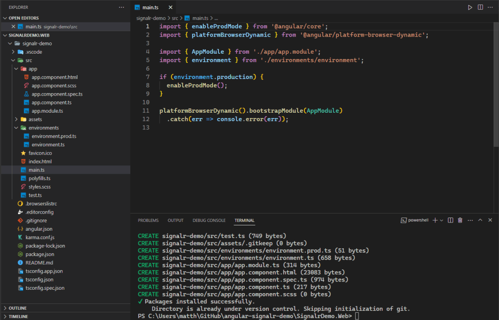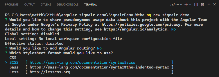 That is it for now on the server side code. We are ready to begin building the front end of our app. Inside the “SignalrDemo.Web” folder, use the ng new Angular CLI command and specify the name to create a new, empty Angular application: ng new signalr-demo. I chose not to add Angular routing since this will be a very simple application for demonstration purposes (this can always be added later), and I chose to use SCSS stylesheets: