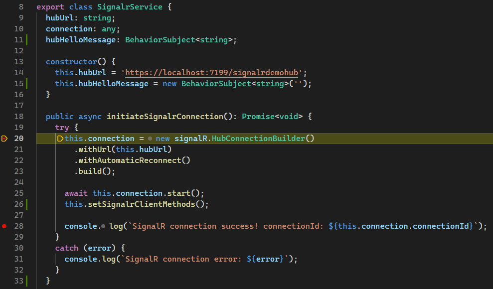 Inside the signalr.service.ts file, SignalR needs to be imported, and two properties need to be added, hubUrl and connection. An async method called initiateSignalrConnection() is also needed. It is to be called on app startup, establishing the SignalR connection to our server before the Angular application load completes, and preventing app load if the SignalR Hub connection fails. Copy the following code to the SignalrService class, replacing its entire contents – the value of hubUrl is set both in “launchSettings.json” (for the port number), and in Program.cs (for the url path):