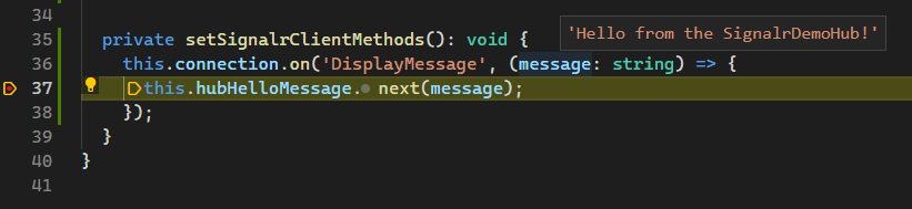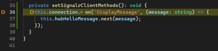The error should now be resolved because our SignalrDemoHub class now knows that the client should implement a method called DisplayMessage(). But since we only created the interface, we still need to actually implement that method on the client. Before we do that, there are two final things to do in our server side code. We need to allow CORS, as the server application will be running on a different URL than the Angular application, and we need to add a SignalR service to the service collection on app startup. Open file Program.cs, and replace its entire contents with the following – this retains the default boilerplate code and adds what is needed for CORS and SignalR to work: