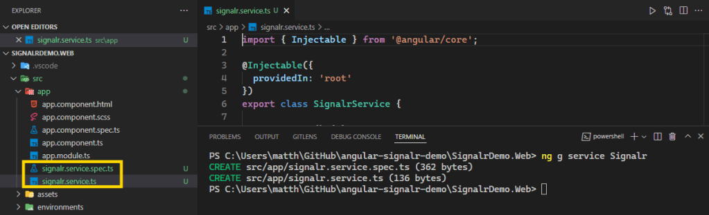 When installation of those packages completes, we will create a SignalrHubService class. This class will encapsulate the client side behavior of SignalR, including establishing a connection between the client and the server, exposing methods which will call the server side Hub methods to the rest of the Angular application, and defining methods to be executed on the client which can be called from the server. Use the ng generate command to create our new service: ng g service Signalr. This will create two new files in the “app” folder, signalr.service.ts and signalr.service.spec.ts: