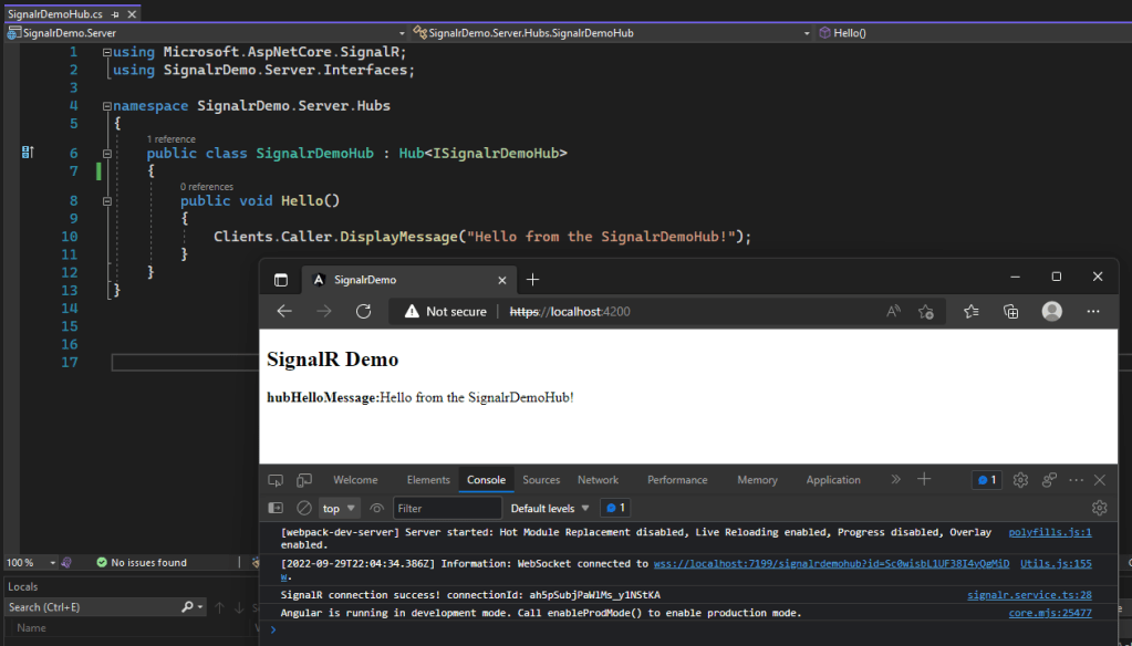 Start the Signalr.Web Angular app with ng serve --ssl true, and open https://localhost:4200 in your browser. Note the “-ssl true” flag when starting the app; this will prevent CORS errors when attempting to connect from an app being served from http (the default in Angular if not specified) to a server using https. In the console you should see a message like “SignalR connection success! connectionId: K8BdqNLhfubrzKaWZTmX9Xg”. The value of the connectionId will change each time the page loads and establishes a new connection.