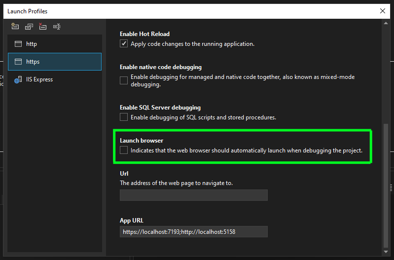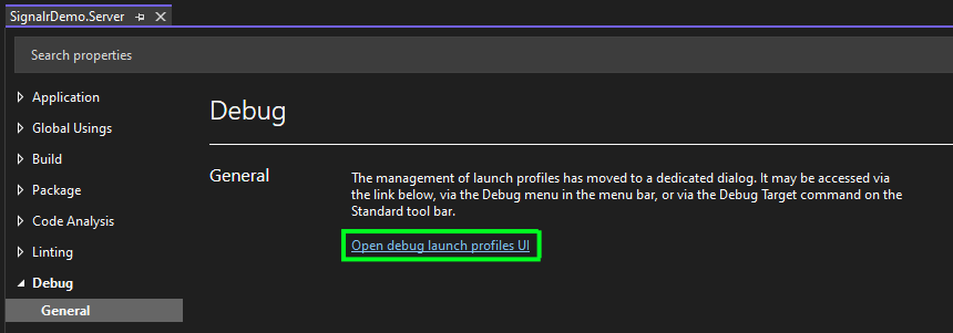 At this point, we’re now ready to fire up the app and make sure everything is working as expected so far! Back in the SignalrDemo.Server .NET app, right click the SignalrDemo.Server project, and select Properties > Debug > General and click “Open debug launch profiles UI.” Select “SignalrDemo.Server” project, uncheck “Launch browser,” and also note the App URLs set here for http and https: