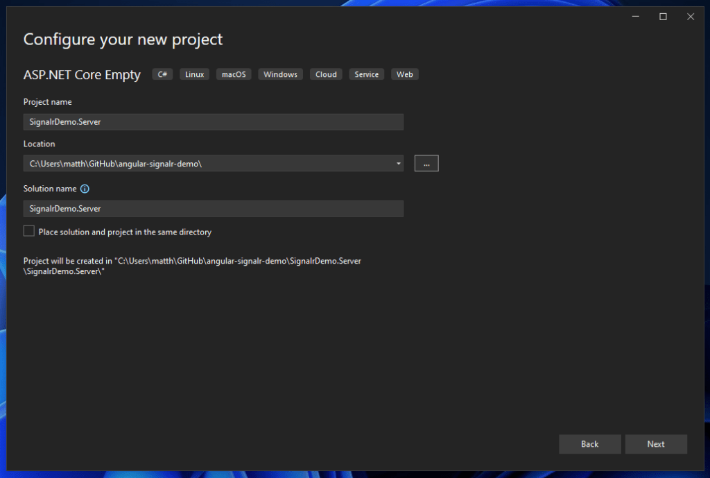 We will name the app “SignalrDemo.Server” and it will be saved in a folder also named “SignalrDemo.Server.”