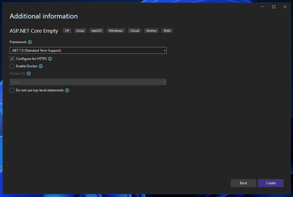 Click “Next”, and on the next screen, select “.NET 6 (Long-term support)”, leave Authentication type as “None”, and check “Configure for HTTPS.” Click “Create” to complete the new project: