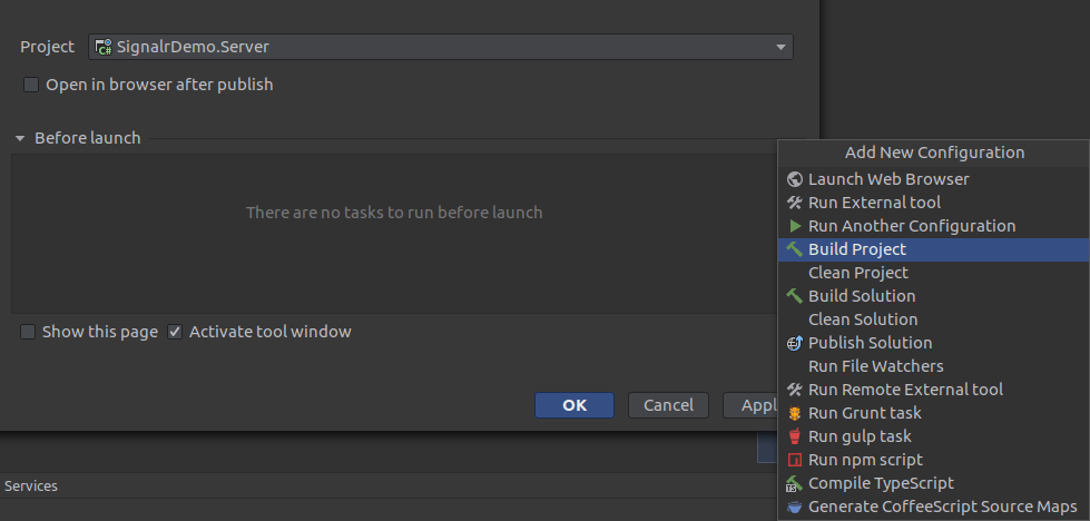 The last step is to specify the “Before Launch” tasks. In here you can build the necessary project(s), run scripts or tasks, or even run other publish configurations: