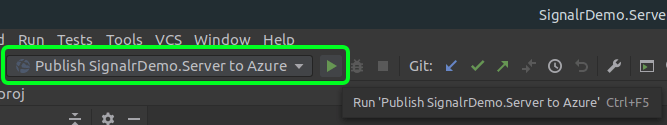 Once the configuration profile is saved, I can select it from the toolbar and and click the run button or press Ctrl + F5, or select the “Run” menu > Run ‘[My Azure Publish Profile Name]’