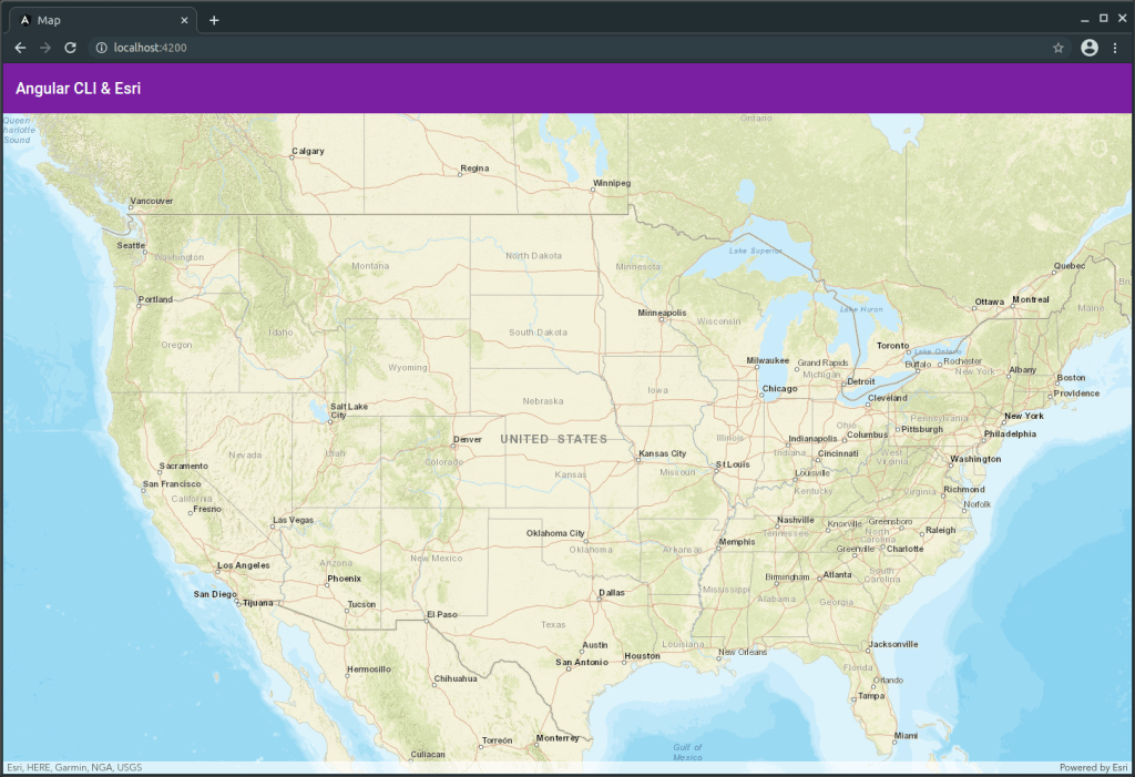 To summarize why the esri-loader package is needed, Esri states that “you can’t simply npm install the ArcGIS API and then import ‘esri’ modules in a non-Dojo application.” (Although future releases of the ArcGIS API will be available through npm). “The only reliable way to load ArcGIS API for JavaScript modules is using Dojo’s AMD loader. However, when using the ArcGIS API in an application built with another framework, you typically want to use the tools and conventions of that framework rather than the Dojo build system.” The esri-loader package exposes a few methods that allow the developer to very easily load the necessary modules from the API and use them within the application. This is the perfect solution for developing applications at my job, as we use Angular. Using the example provided by Esri, I can generate a MapComponent in my Angular app, import the esri-loader module and the esri types, and then load the ArcGIS modules to construct a map. My new MapComponent class looks something like this: