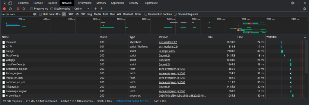 When the component is compiled, the ngAfterViewInit() method is called after the view is fully initialized, which then calls the initDefaultMap() method I added to the class. Inside initDefaultMap() the esri-loader loadModules() method is called to load the Map and MapView API modules. By default, the esri-loader will load the API modules from the Esri CDN, making one or more HTTP requests to fetch the necessary resources. (You can also specify the location and version of the API to load). This can be observed by inspecting the network traffic when loading your app: