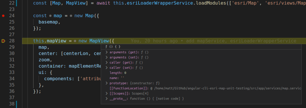 So far so good – we’ve eliminated the tight coupling between the MapComponent class and the loadModules() method by moving the logic which loads the ArcGIS API’s modules and creates the map objects to the MapService which can be injected into the MapComponent class. This allows us to mock that behavior in tests for the MapComponent class, and eliminate the HTTP requests being made by loadModules(), but still write a strong test which asserts the component was created correctly. But if we want to test the MapService class we still have the same problem: the call to loadModules() inside the initDefaultMap() method will make those HTTP requests to fetch the API resources for the module names we specify, and the individual methods imported from the esri-loader package are still difficult to mock.