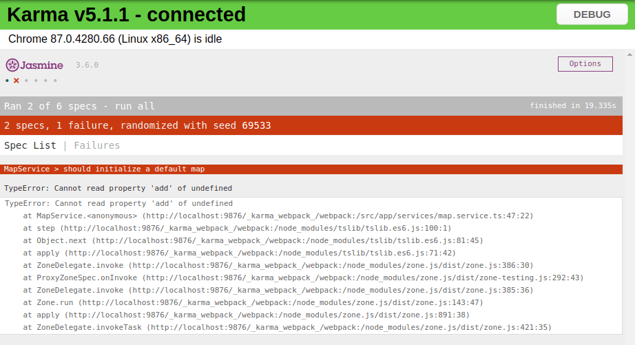 Inside the updated test suite, we have created a Spy for the MapService.initDefaultMap() method which returns a resolved Promise<void>. Now the 'should initialize MapComponent' test will assert that the component has been created (is truthy), and assert that the MapService.initDefaultMap() method was called with the expected parameters. But this time, our mocked implementation of initDefaultMap() was called: spyOn(component.mapService, 'initDefaultMap').and.returnValue(Promise.resolve()); and not the real implementation which calls the esri-loader loadModules() method that makes the HTTP requests to fetch the API resources. This can be verified by inspecting the network traffic while running the tests; there are no requests to arcgis.com:
