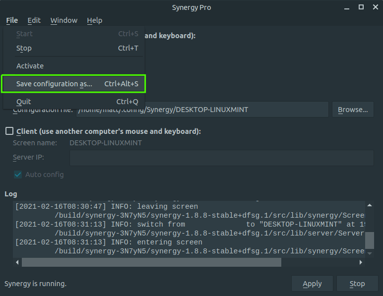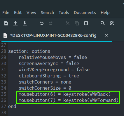 I’ve been using Synergy for around a decade – about as long as I have been simultaneously using multiple computers and devices and working as a software engineer from home in some capacity. Everything works well out of the box with Synergy after going through some basic configuration, but the one minor annoyance was that the forward and back buttons on the side of my mouse never worked on the client (the computer which does not have the keyboard and mouse plugged into it.) After finding Alex’s post on this very topic, I immediately applied his fix. I first exported the configuration I had originally set up interactively with File > Save configuration as…