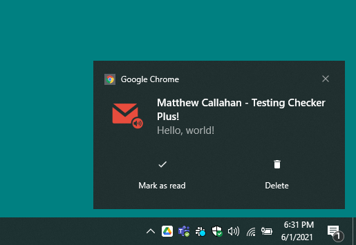 To complete the desktop-like experience, I installed the Checker Plus for Gmail and Checker Plus for Google Calendar Chrome extensions by Jason Savard. The built-in desktop notifications which can be configured in the Chrome settings leave a lot to be desired as far as customization. In some cases, I observed that the notifications are buggy or display inconsistently, and at the time of writing this, I was not able to get desktop notifications for Gmail to work at all. I disabled notifications in the Chrome settings for the Gmail and Google Calendar urls, and rely on the Checker Plus extensions for receiving native OS desktop notifications from these two Google Workspace apps. Clicking a Gmail notification yields the desired behavior by opening the dedicated Gmail app window, and not a new tab in the browser.