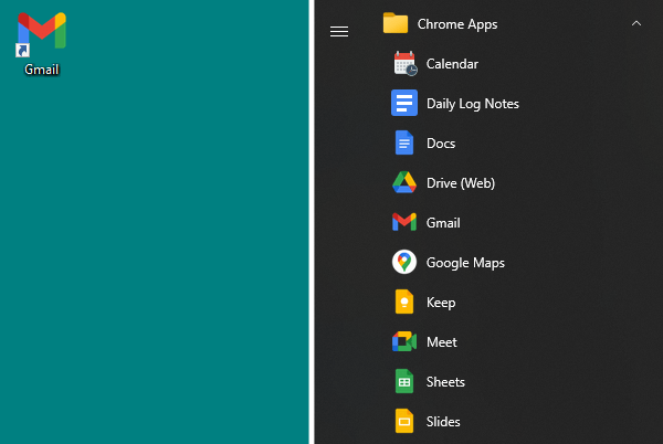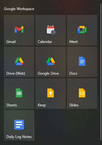 I pinned all the Google Workspace apps for which I had made a shortcut to the start menu: