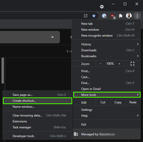 To accomplish this, I used the “Create shortcut” feature found in Chrome. For each of the Chrome web apps I wanted to use as a desktop app, I loaded the page, clicked the Chrome menu button (the button with three dots in the upper right corner), selected “More tools” and then “Create shortcut.”