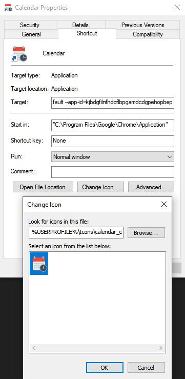 I didn’t like the default icon for the Google Calendar shortcut in Windows so I used my own. The app shortcut files can be found in this folder:C:\Users\YourUserName\AppData\Roaming\Microsoft\Windows\Start Menu\Programs\Chrome Apps\