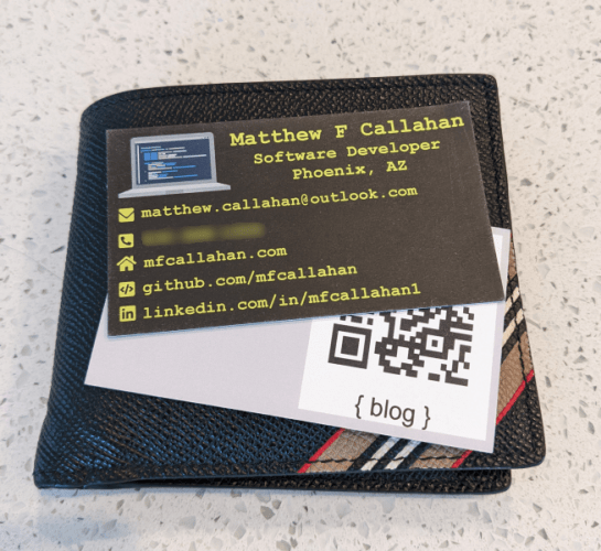 Business cards are usually kinda boring: they contain your name, the name of the company for whom you are working, contact information, and maybe a nice logo. There’s nothing wrong with being boring when it comes to business cards, though – they have enough information for someone to get in touch with you. When representing a company, that’s all I need. But I’m not just a programmer by occupation – for many, it’s also a hobby, a never-ending pursuit of knowledge in computers. I like talking shop and networking with people about computers & software development outside of a work context. I don’t like giving out an official work business card in these settings as I’m not representing my company, just myself. I wanted a personal “business” card (or I guess just a contact card) to make it easy for someone to remember my information and get in touch with me in the future, should they ever feel so inclined. It’s 2022, and I know business cards are becoming an increasingly rare sight at first meetings, but I figured why not have some fun with it. I ordered up these ultra-cool terminal font business cards from Vistaprint: