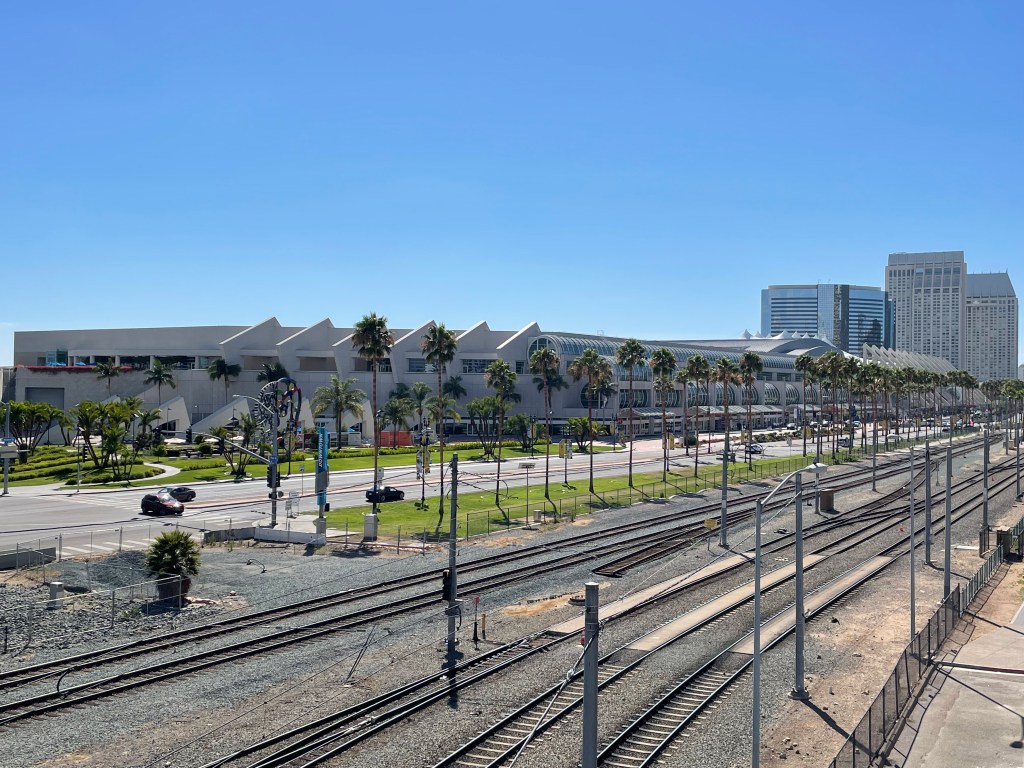 The opposite end of the Convention Center, looking northwest from the pedestrian bridge to Petco Park. The building is huge – to walk from one end to the other, indoors, is about 1/3 of a mile!