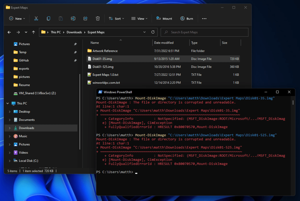 After a quick history lesson, I was ready to fire up Expert Maps and create some beautiful cartography. This program was originally released for Tandy and and IBM compatible PCs, and it’s probably safe to assume that a typical customer would have been using MS-DOS. I could easily start up a virtual machine running DOS 3.0 or later (per the Expert Maps system requirements), but I wanted to try something a bit different and see if it would run under a modern operating system, an OS that it was never intended to run on. I first tested with Windows 11; inside the downloaded .7z file, there were two disk “.img” image files. To use these, they must be mounted by the operating system just like a physical disk, but I was not able to do this successfully via the right clicking the file in File Explorer and selecting “Mount” or with the Mount-DiskImage PowerShell command, getting an error message that the file was corrupted.