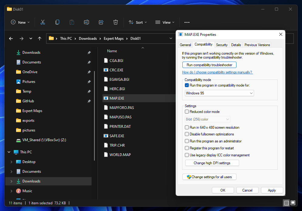 Each disk .img contained the same files, so I selected the contents of one and copied it back to my Windows 11 machine. “MAP.EXE” seems like a good place to jump in, but it wouldn’t run; messing with the compatibility settings did not have any effect either.