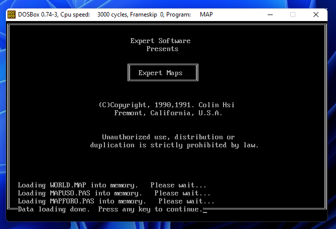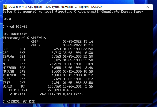 This isn’t a dead end however – DOSBox comes to the rescue. DOSBox is cross-platform emulator for MS-DOS, and will allow modern versions of Windows, Linux, and macOS to run old software which was originally released for MS-DOS compatible operating systems. Setup is easy, download DosBOX and start it up. The concept of mounting disks again applies here, and I need to mount the folder containing Expert Maps, per the DosBOX documentation. Once mounted, I can navigate to the folder, use dir to list all the files, and start up “MAP.EXE.”