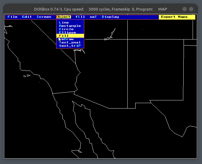 It’s also worth noting that DosBOX and Expert Maps also run under Linux – below is the startup animation when running on Pop!_OS 22.04. Once I pressed the anykey, Expert Maps takes full advantage of your EGA (or newer) display with this cool animation. The remainder of the screenshots below are from Expert Maps running on Linux; I observed a little smoother cursor movement in the app under this configuration vs. Windows 11.