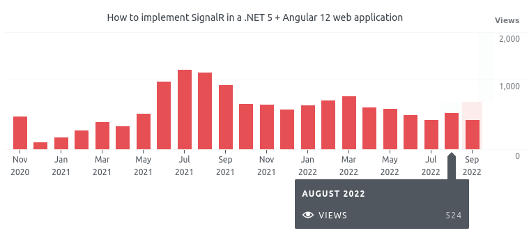 My original blog post detailing the implementation of SignalR in a .NET and Angular app has become a somewhat popular search engine result for “signalr + angular”, getting about 500 views per month. While that’s not a extremely large amount of traffic, this is a bit of a niche topic. The steady traffic over two years and all other feedback I have received has shown me that it has been useful for people looking to use SignalR in their Angular app.