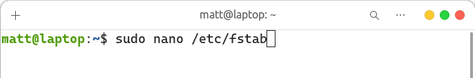Next, open file /etc/fstab with root privileges; I find the easiest way to make quick modifications to config files is using the Nano terminal text editor. Open the file with command sudo nano /etc/fstab